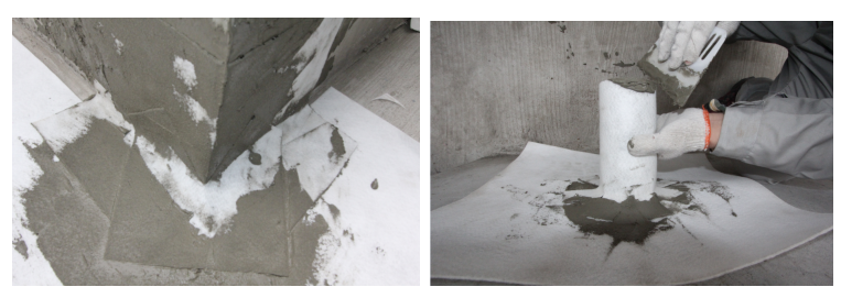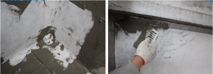 5、細(xì)部節(jié)點(diǎn)處理 1、陽(yáng)角、陰角: 1.1將陽(yáng)角、陰角部位浮漿、雜物鏟除,清理干凈后,若基面干燥時(shí)散水濕潤(rùn),掃除明水。 1.2陽(yáng)角、陰角用水泥砂漿或防水砂漿抹成圓弧,圓弧半徑不小于50mm。 1.3裁剪一條寬500mm的卷材作為陽(yáng)角或陰角附加防水層,然后涂刷水泥膠粘劑鋪設(shè)。 1.4陽(yáng)角、陰角交接處附加層卷材在中心位置向一邊方向裁開(kāi),在方形卷材底部中間處劃一刀到卷材中心點(diǎn),使得卷材下沿叉開(kāi),然后涂刷水泥膠粘劑鋪設(shè)。 1.5再裁剪一塊(略成扇形)卷材,涂刷水泥膠粘劑后鋪設(shè)在開(kāi)叉處的上面,將露出部位全部遮蓋。 2、管根部位: 2.1清理管根部位四周基面及管道壁,鐵管進(jìn)行除銹打磨,PVC管表面用鋼絲刷打磨粗糙,基面若基面干燥時(shí)散水濕潤(rùn),掃除明水。 2.2在管根部涂刷水泥膠粘劑,立面250mm高,平面超出洞口250mm寬。 2.3根據(jù)管道外徑剪一塊方形卷材,尺寸比管根半徑長(zhǎng)250mm,沿著卷材中心,劃開(kāi)呈十字狀或米字狀的缺口,將劃開(kāi)的卷材套入管道用滿粘法將卷材鋪設(shè)。 2.4根據(jù)管道外徑裁剪一條長(zhǎng)度大于管徑100mm,寬度不小于250mm的卷材,將其下端裁成鋸齒狀。將卷材套在管子的外面,然后用滿鋪法將卷材緊密粘貼在管道外壁,上下層接縫粘結(jié)時(shí)應(yīng)上下錯(cuò)開(kāi),平整嚴(yán)密,管道上端卷材用金屬箍或用鐵絲扎牢。