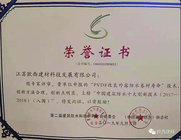 在科技創(chuàng)新的路上,歐西建科高度重視,踐行創(chuàng)新精神,成就專業(yè)與品質(zhì),在本次創(chuàng)新大會(huì)上,歐西建科的“PVDF改良外露防水卷材壽命”項(xiàng)目獲得“中國建筑防水創(chuàng)新技術(shù)(入圍)榜”獎(jiǎng)項(xiàng)。