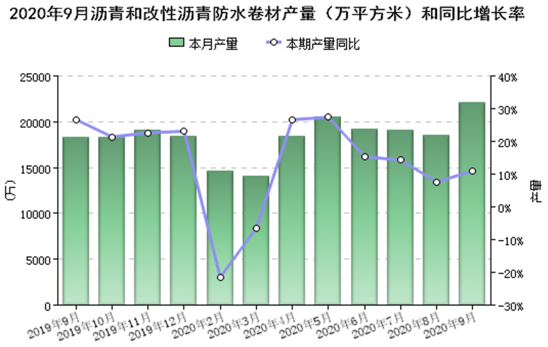 從當月產(chǎn)量來看,2020年9月份,瀝青和改性瀝青防水卷材全國產(chǎn)量為22115.73萬平方米,比去年同月增長11.00%。1-9月份,714家規(guī)模以上(主營業(yè)務收入在2000萬元以上)防水企業(yè)的主營業(yè)務收入累計為749.23億元,比去年同期增長3.9%,增速比去年同期下降12.4個百分點。規(guī)模以上企業(yè)的利潤總額達54.06億元,比去年同期增長18.75%,增速比去年同期增長3.99個百分點。