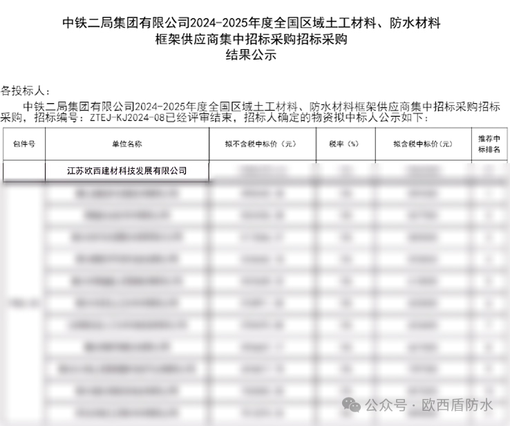 近日,中鐵二局集團(tuán)有限公司完成了2024—2025年度全國(guó)區(qū)域土工材料、防水材料框架供應(yīng)商集中招標(biāo)采購(gòu)招標(biāo),并公示了相關(guān)結(jié)果,其中,江蘇歐西建材科技發(fā)展有限公司成功入列。