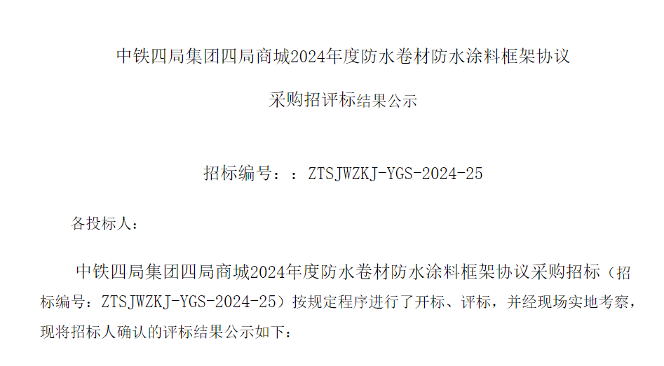 近日,中鐵四局集團(tuán)四局商城2024年度防水卷材防水涂料框架協(xié)議采購招標(biāo),評標(biāo)結(jié)果完成公示,其中,江蘇歐西建材科技發(fā)展有限公司成功入列。