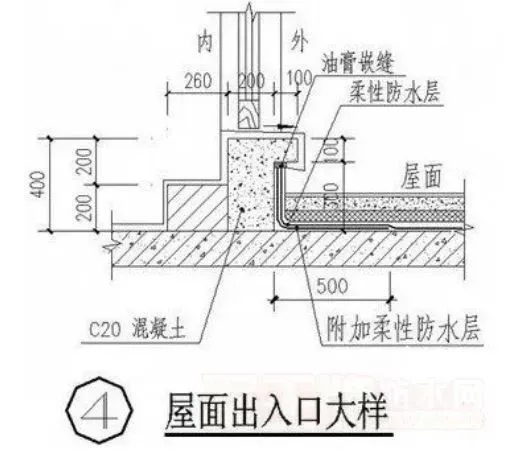 屋面出進(jìn)口因使用頻繁會(huì)組成提早粉碎,出進(jìn)口處防水層收頭應(yīng)處置妥貼,除外,應(yīng)適當(dāng)作加強(qiáng)層,并要求外觀作防水層,如水泥沙漿防水層等。