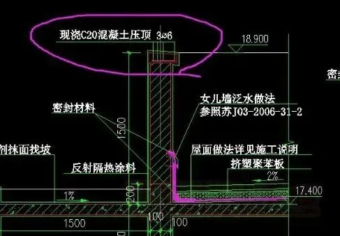 壓頂處于屋面的最高處,直接暴露于自然狀況中,受天氣影響大,受整個(gè)縱向墻體溫差、構(gòu)造受力變形及墻體混凝土和沙漿干縮變形的影響也很大,因而即便是配筋混凝土壓頂,其橫向破綻也是不可避免的。多在3~5年內(nèi)破綻均會(huì)鮮明地展開,配筋混凝土壓頂,在5~8m以內(nèi)就會(huì)有1條破綻展開,不配筋混凝土在1m支配就有1條破綻。雨水順破綻到墻內(nèi),繞過防水層漏到室內(nèi),以是壓頂必需作柔性涂料加強(qiáng)層。普通是作在壓頂下,假定選材不當(dāng),或許會(huì)組成壓頂和女兒墻分層,目前只需聚合物水泥基涂料和聚合物水泥沙漿概略用于此處防水;另一種是將防水層作在壓頂下面,采取卷材粘貼或用涂料涂刷。